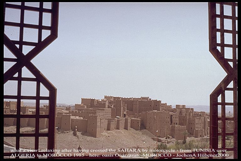 after crossing SAHARA East-West in summer 1985 with BMW-offroad motorcycle 'R80GS Paris-Dakar', here: oasis OUARZAZATE, MOROCCO, what a view_Jochen A. Hübener