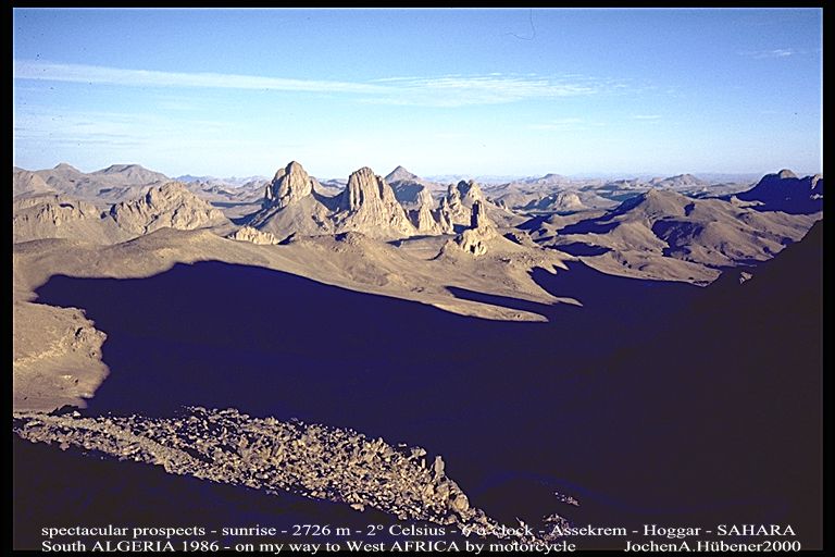 ALGERIA_crossing SAHARA with motorcycles_Assekrem, Hoggar, 2700m_sunrise at 6 o´clock, temperature 2° C_fantastic scenery_on my way to West-Africa, to Cameroon 1986_Jochen A. Hübener