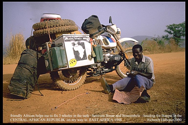 1987/88_Central African Republic_friendly African helped me to fix 3 holes in the tank_between Bouar and