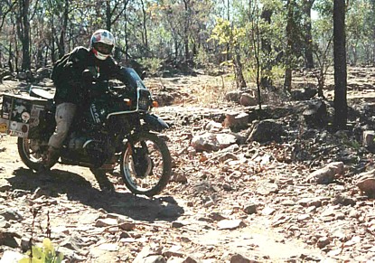 Jochen with BMW R100GS, crossing roughly, stony, rocky